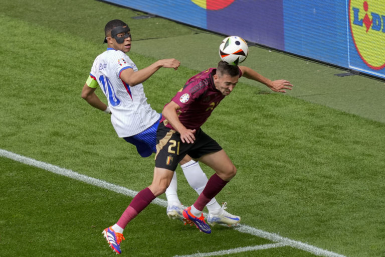 Belgický reprezentant Timothy Castagne hlavičkuje loptu pred Francúzom Kylianom Mbappém počas osemfinálového zápasu na ME vo futbale 2024. Düsseldorf, 1. júl 2024. Foto: SITA/AP.