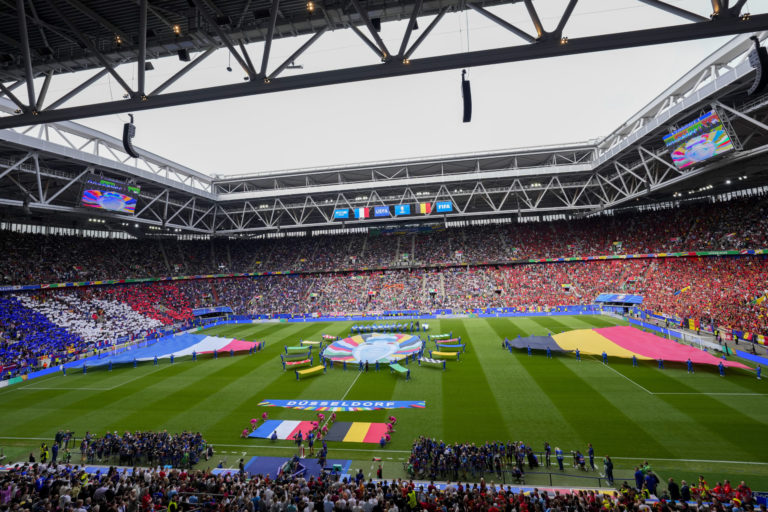Úvodný ceremoniál osemfinálového zápasu medzi Francúzskom a Belgickom na ME vo futbale 2024. Düsseldorf, 1. júl 2024. Foto: SITA/AP.