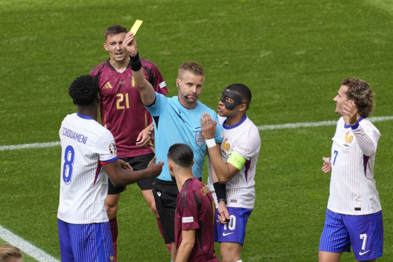 Francúzsky reprezentant Aurelien Tchouameni dostáva žltú kartu v prvom polčase osemfinálového zápasu proti Belgicku na ME vo futbale 2024. Düsseldorf, 1. júl 2024. Foto: SITA/AP.