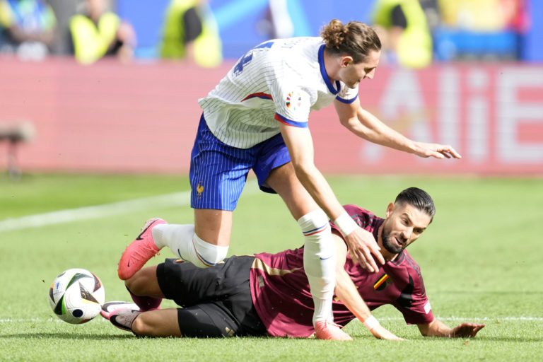 Belgický reprezentant Dodi Lukebakio v súboji s Francúzom Adrien Rabiotom počas osemfinálového zápasu na ME vo futbale 2024. Düsseldorf, 1. júl 2024. Foto: SITA/AP.