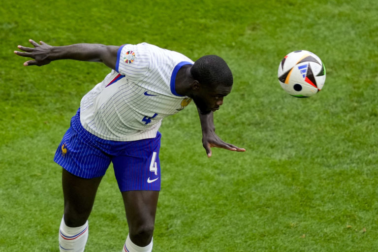 Francúzsky reprezentant Dayot Upamecano hlavičkuje v zápase proti Belgicku v osemfinále ME vo futbale 2024. Düsseldorf, 1. júl 2024. Foto: SITA/AP.