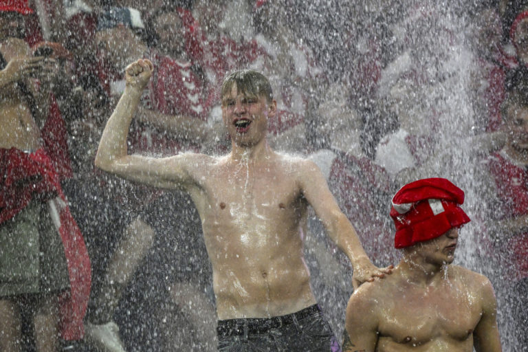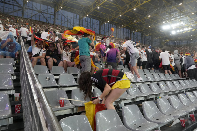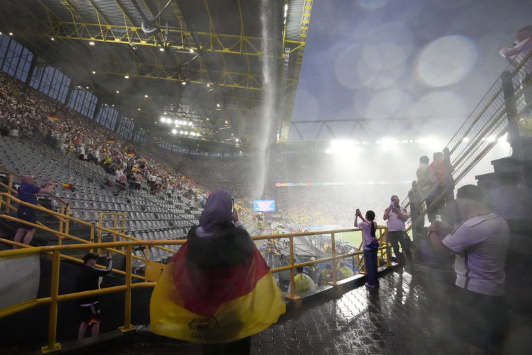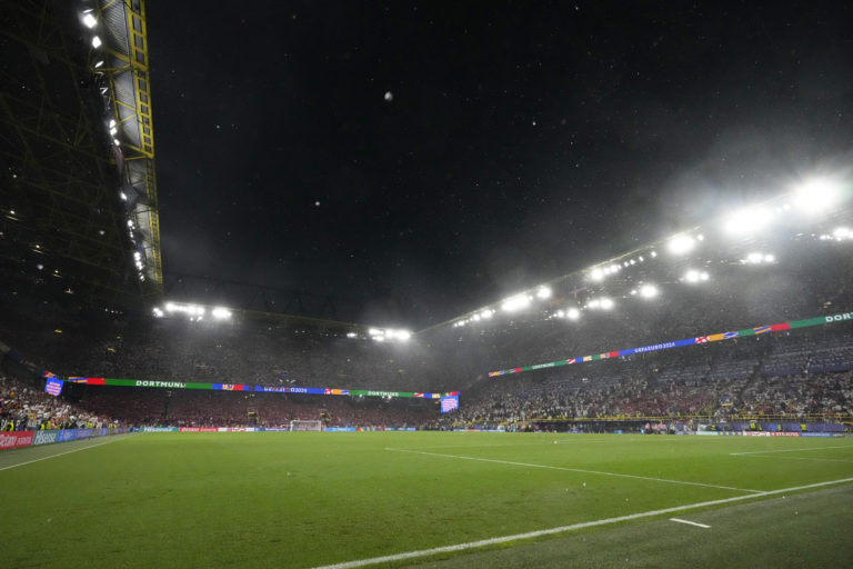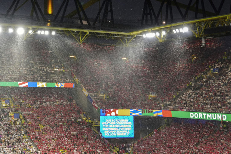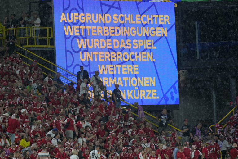 Osemfinálový zápas na ME vo futbale 2024 medzi domácim Nemeckom a Dánskom v 35. minúte prerušila búrka. Dortmund, 29. jún 2024. Foto: Marcus Brandt/dpa via AP.