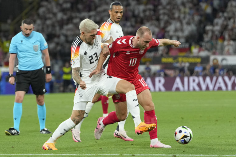 Nemecký reprezentant Robert Andrich v súboji s Dánom Christianom Eriksenom počas osemfinálového zápasu na ME vo futbale 2024. Dortmund, 29. jún 2024. Foto: SITA/AP.