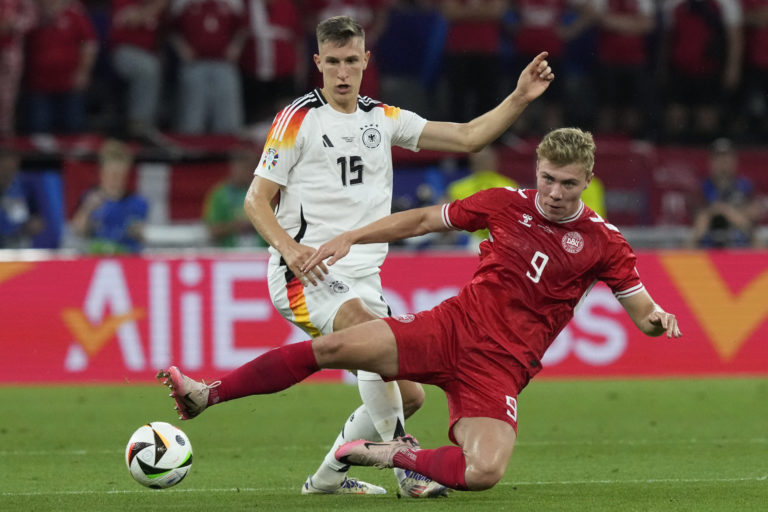 Dánsky reprezentant Rasmus Hojlund v súboji s Nemcom Nicom Schlotterbeckom počas osemfinálového zápasu na ME vo futbale 2024. Dortmund, 29. jún 2024. Foto: SITA/AP.