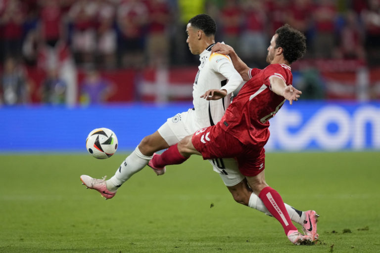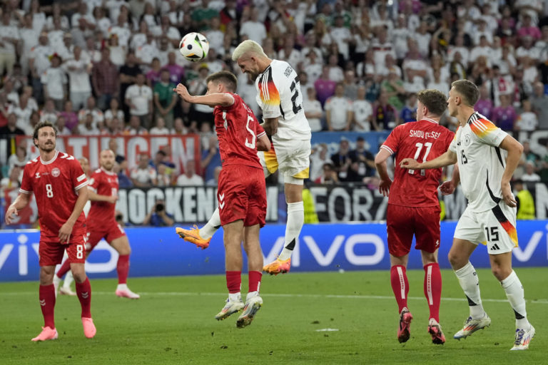 Hlavičkový súboj v osemfinálovom zápase ME vo futbale 2024 medzi Nemeckom a Dánskom. Dortmund, 29. jún 2024. Foto: SITA/AP