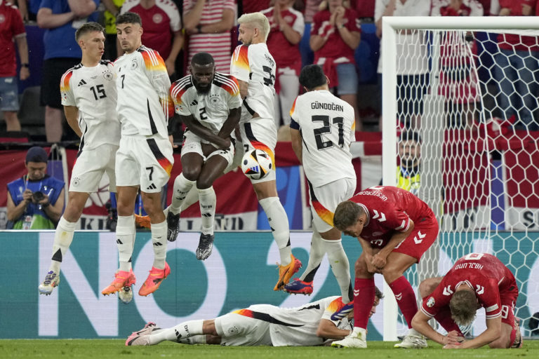 Nemeckí reprezentanti v múre zblokovali loptu po priamom kope Dána Christiana Eriksena počas osemfinálového zápasu na ME vo futbale 2024. Dortmund, 29. jún 2024. Foto: SITA/AP.
