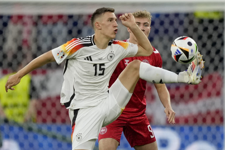 Nemecký reprezentant Nico Schlotterbeck si spracováva loptu v zápase proti Dánsku v osemfinále ME vo futbale 2024. Dortmund, 29. jún 2024. Foto: SITA/AP.