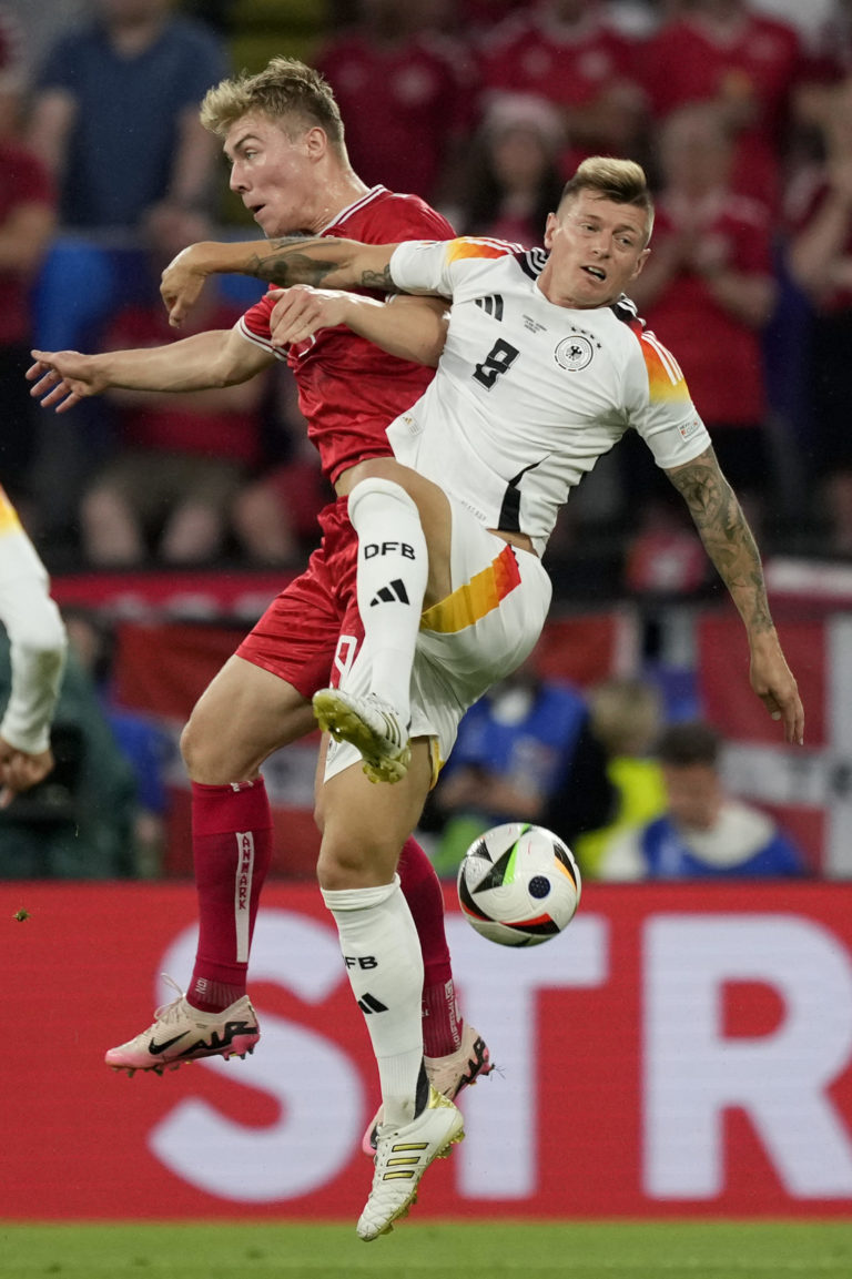 Dánsky reprezentant Rasmus Hojlund v súboji s Nemcom Tonim Kroosom počas osemfinálového zápasu na ME vo futbale 2024. Dortmund, 29. jún 2024. Foto: SITA/AP.