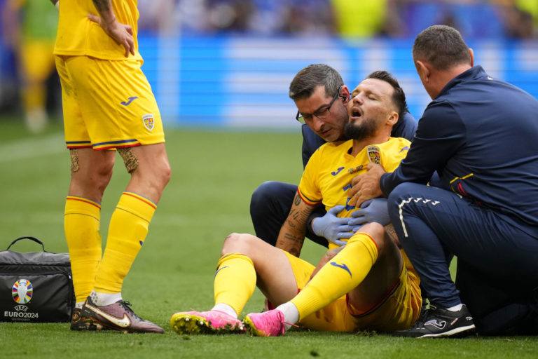 Otrasený rumunský reprezentant Vasile Mogos počas osemfinálového zápasu proti Rumunsku na ME vo futbale 2024. Mníchov, 2. júl 2024. Foto: SITA/AP.