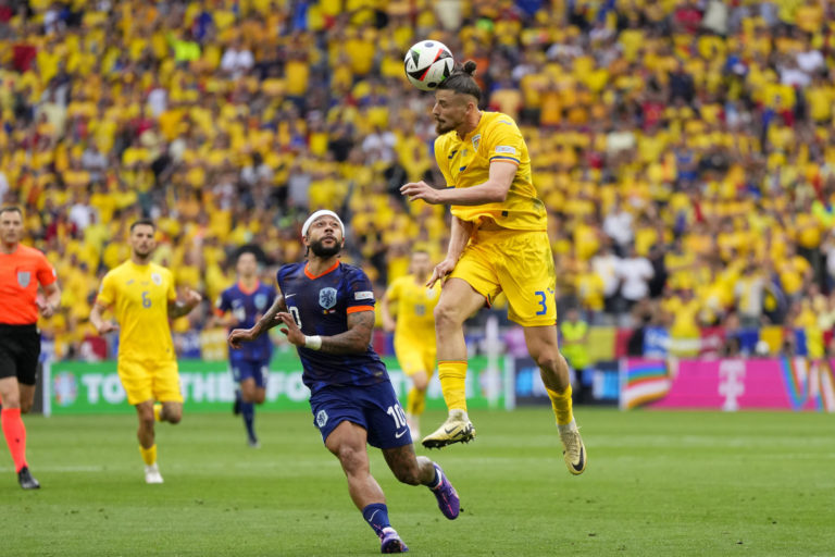 Rumunský reprezentant Radu Dragušin hlavičkuje loptu pred Holanďanom Memphisom Depayom počas osemfinálového zápasu na ME vo futbale 2024. Mníchov, 2. júl 2024. Foto: SITA/AP.