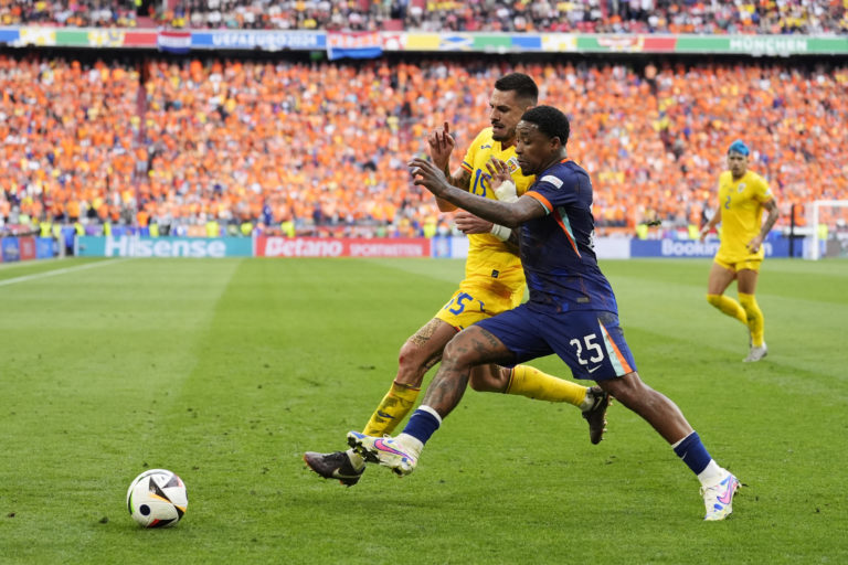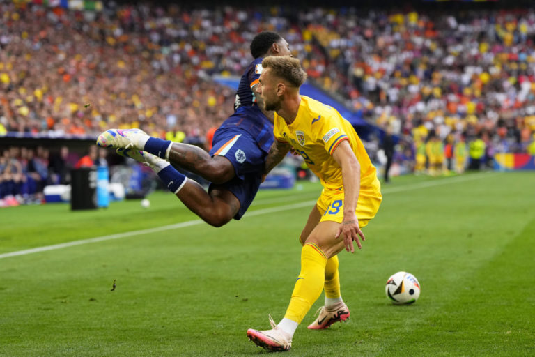 Rumunský reprezentant Andrej Burca v súboji s Holanďanom Stevenom Bergwijnom počas osemfinálového zápasu na ME vo futbale 2024. Mníchov, 2. júl 2024. Foto: SITA/AP.