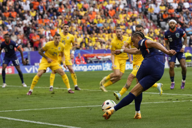 Gól Holanďana Codyho Gakpa v osemfinálovom zápase proti Rumunsku na ME vo futbale 2024. Mníchov, 2. júl 2024. Foto: SITA/AP.