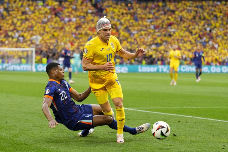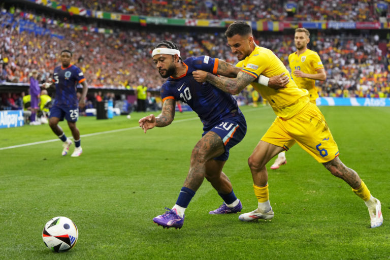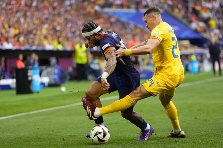 Rumunský reprezentant Marius Marin v súboji s Holanďanom Memphisom Depayom počas osemfinálového zápasu na ME vo futbale 2024. Mníchov, 2. júl 2024. Foto: SITA/AP.