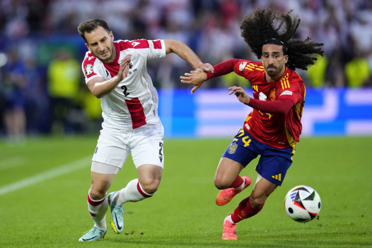 Gruzínsky reprezentant Otar Kakabadze v súboji so Španielom Marcom Cucurellom počas osemfinálového zápasu na ME vo futbale 2024. Kolín nad Rýnom, 30. jún 2024. Foto: SITA/AP.