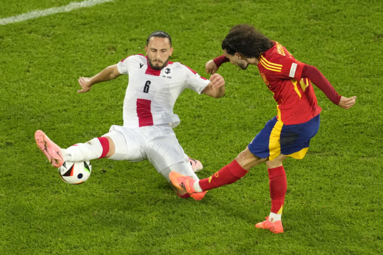 Gruzínsky reprezentant Giorgi Kochorašvili zablokoval strelu Španiela Marca Cucurellu počas osemfinálového zápasu na ME vo futbale 2024. Kolín nad Rýnom, 30. jún 2024. Foto: SITA/AP.