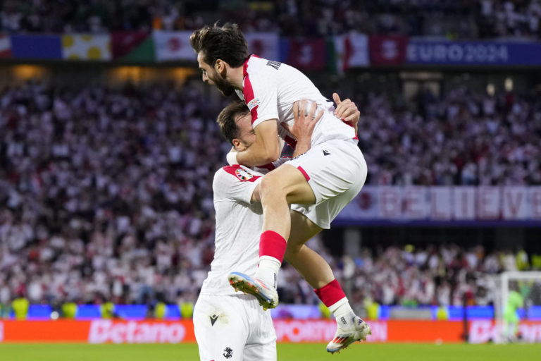 Gruzínci Khvicha Kvaratskhelia a Otar Kakabadze sa tešia z gólu v sieti Španielska počas osemfinálového zápasu na ME vo futbale 2024. Kolín nad Rýnom, 30. jún 2024. Foto: SITA/AP.