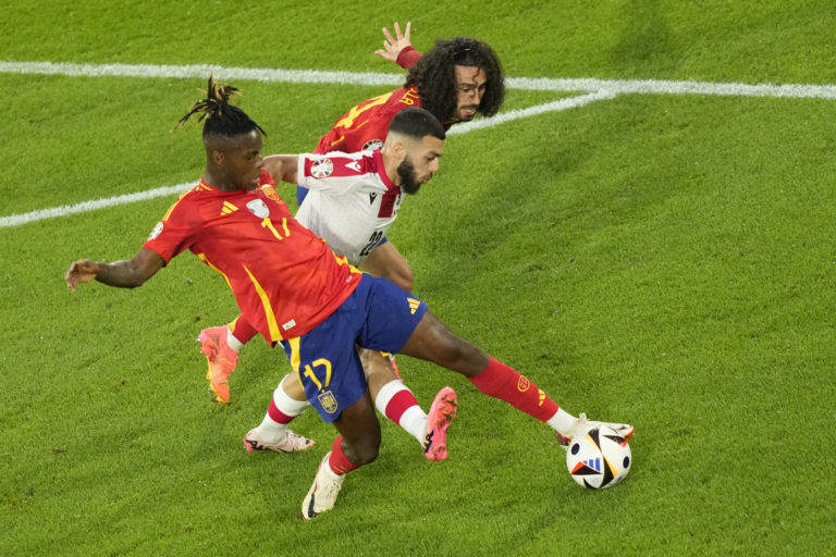 Španielsky reprezentant Nico Williams v obkľúčení gruzínskych reprezentantov počas osemfinálového zápasu na ME vo futbale 2024. Kolín nad Rýnom, 30. jún 2024. Foto: SITA/AP