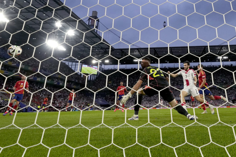Vlastný gól španielskeho reprezentanta Robina Le Normanda v osemfinálovom zápase proti Gruzínsku na ME vo futbale 2024. Kolín nad Rýnom, 30. jún 2024. Foto: SITA/AP.