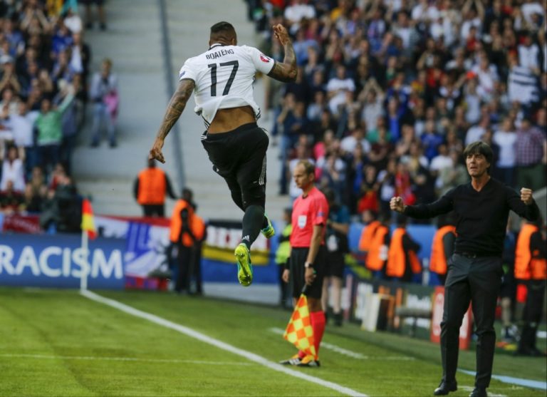 Nemecký futbalista Jerome Boateng sa radujú z gólu v sieti Slovenska počas zápasu na majstrovstvách Európy. Lille, 26. jún 2016. Foto: SITA/AP