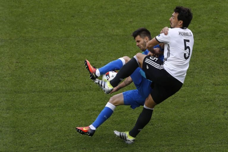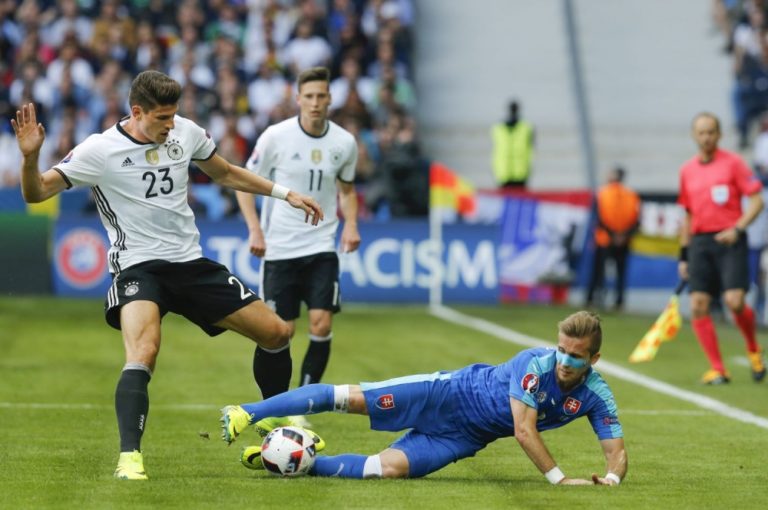 Slovenský futbalista Peter Pekarík padá po súboji s Nemcom Mariom Gómezom počas osemfinálového zápasu na majstrovstvách Európy. Lille, 26. jún 2016. Foto: SITA/AP