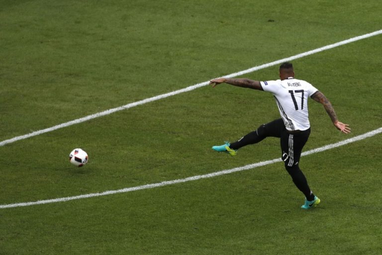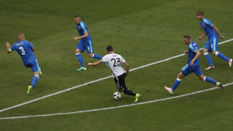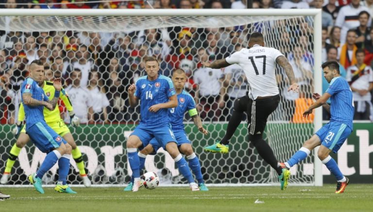 Nemecký futbalista Jerome Boateng touto strelou otvoril skóre zápasu proti Slovensku na majstrovstvách Európy. Lille, 26. jún 2016. Foto: SITA/AP