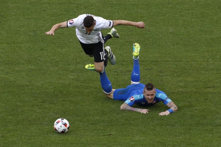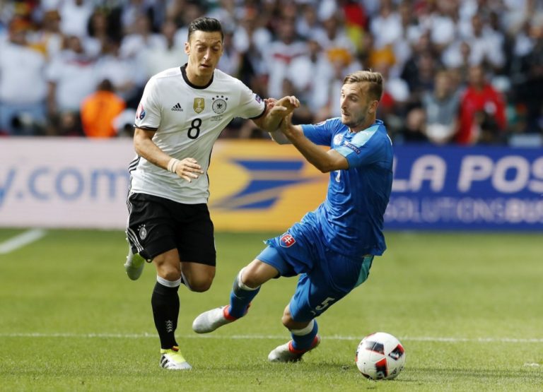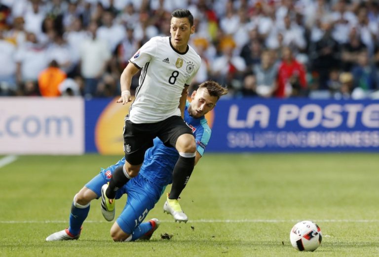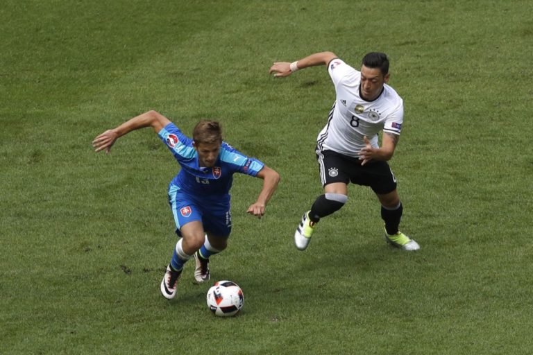 Nemecký futbalista Mesut Özil v súboji so Slovákom Norbertom Gyömbérom počas zápasu na majstrovstvách Európy. Lille, 26. jún 2016. Foto: SITA/AP