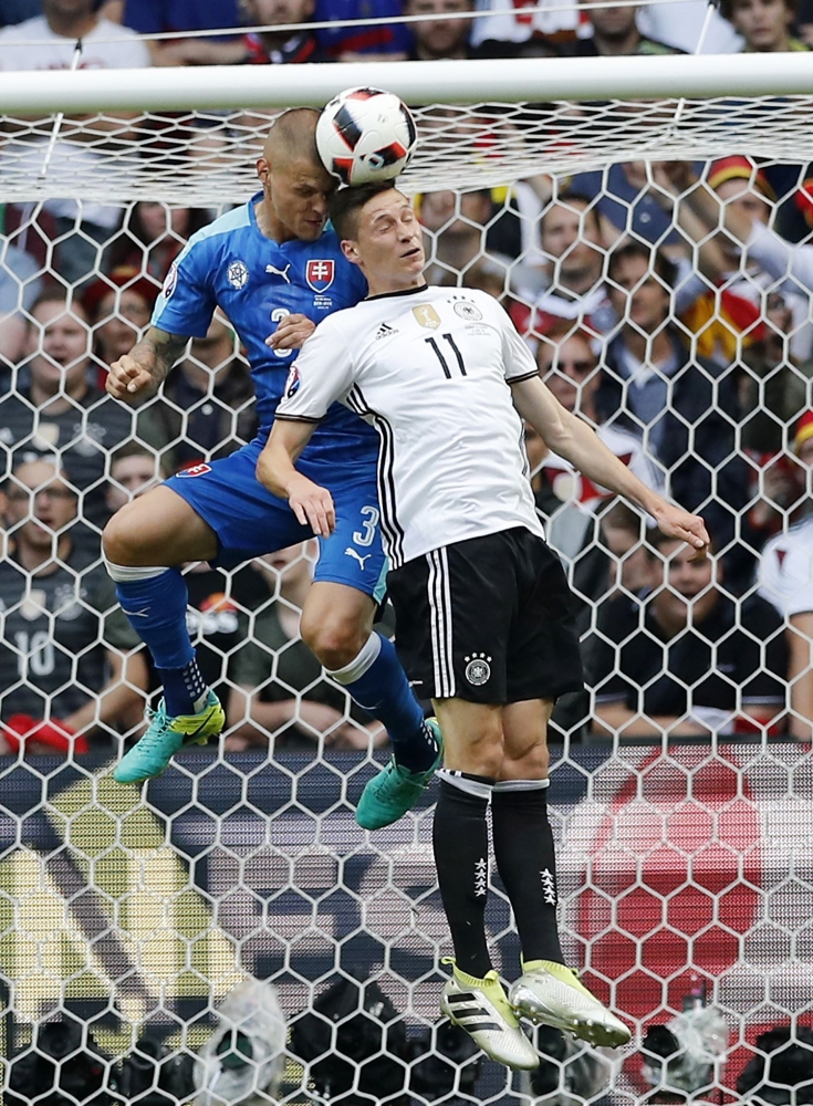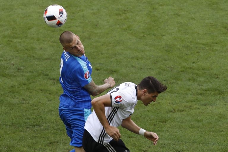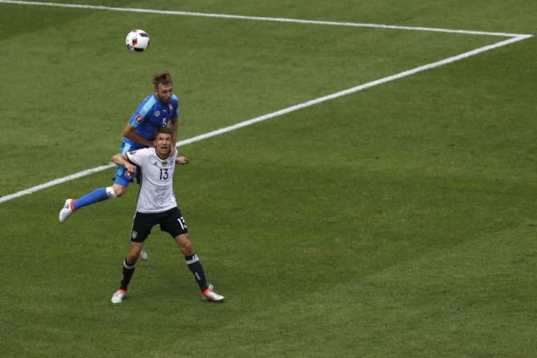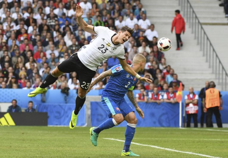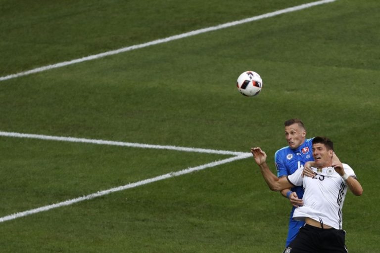 Slovenský obranca Martin Škrtel v hlavičkovom súboji s Nemcom Mariom Gómezom počas osemfinálového zápasu na majstrovstvách Európy. Lille, 26. jún 2016. Foto: SITA/AP