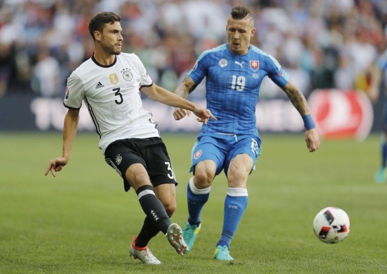 Nemecký futbalista Mats Hummels v súboji so Slovákom Norbertom Gyömbérom počas zápasu na majstrovstvách Európy. Lille, 26. jún 2016. Foto: SITA/AP