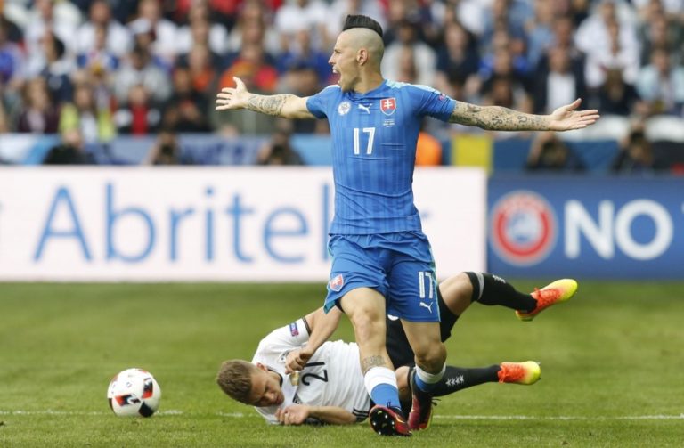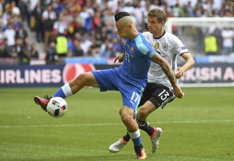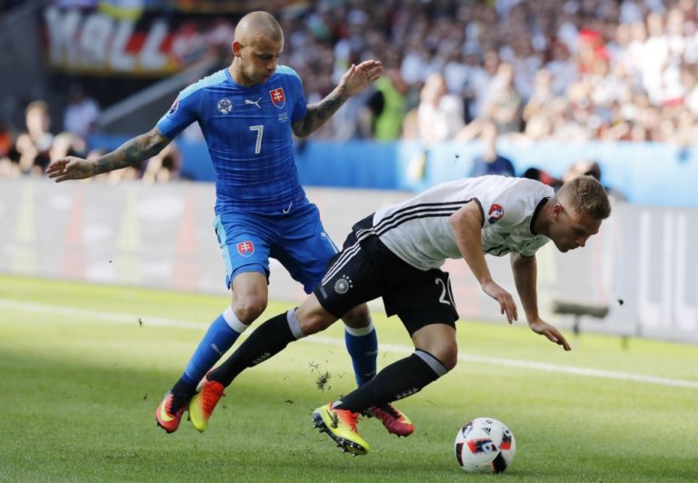 Slovenský futbalista Vladimír Weiss v súboji s nemeckým obrancom Joshuom Kimmichom počas osemfinálového zápasu na majstrovstvách Európy. Lille, 26. jún 2016. Foto: SITA/AP