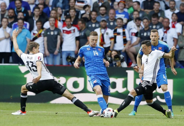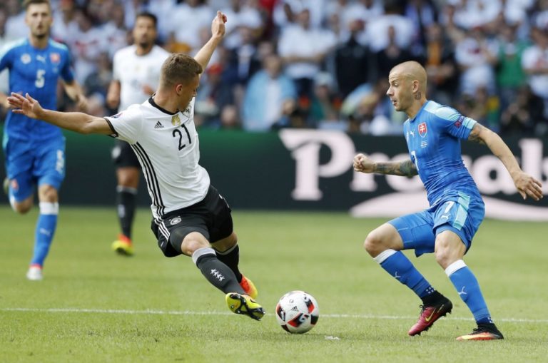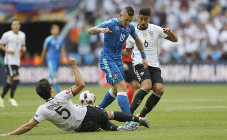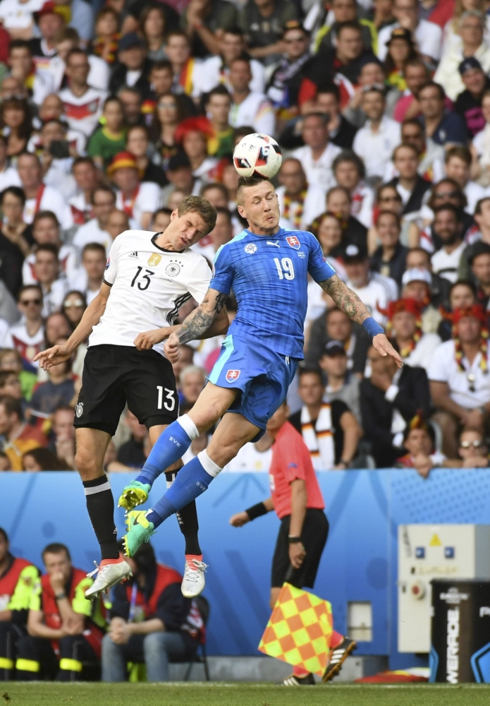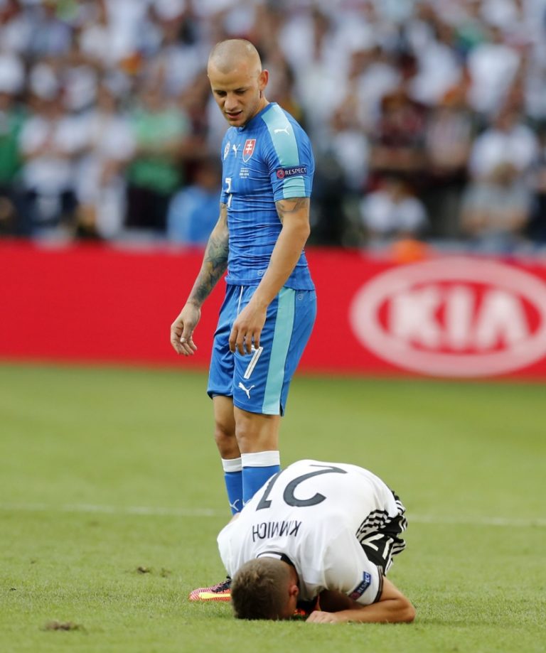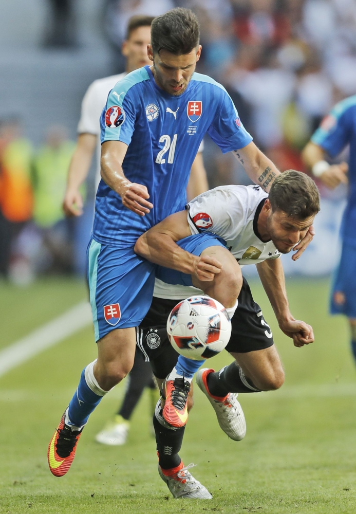 Slovenský futbalista Juraj Kucka v súboji s Nemcami počas osemfinálového zápasu na majstrovstvách Európy. Lille, 26. jún 2016. Foto: SITA/AP