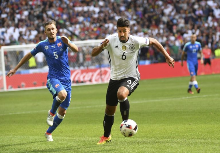 Slovenský futbalista Norbert Gyömbér stíha Nemca Samiho Khediru počas zápasu na majstrovstvách Európy. Lille, 26. jún 2016. Foto: SITA/AP