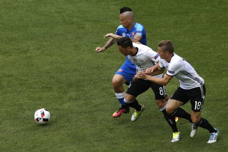Nemeckí futbalisti Mesut Özil a Tony Kroos v súboji s Markom Hamšíkom počas zápasu na majstrovstvách Európy. Lille, 26. jún 2016. Foto: SITA/AP