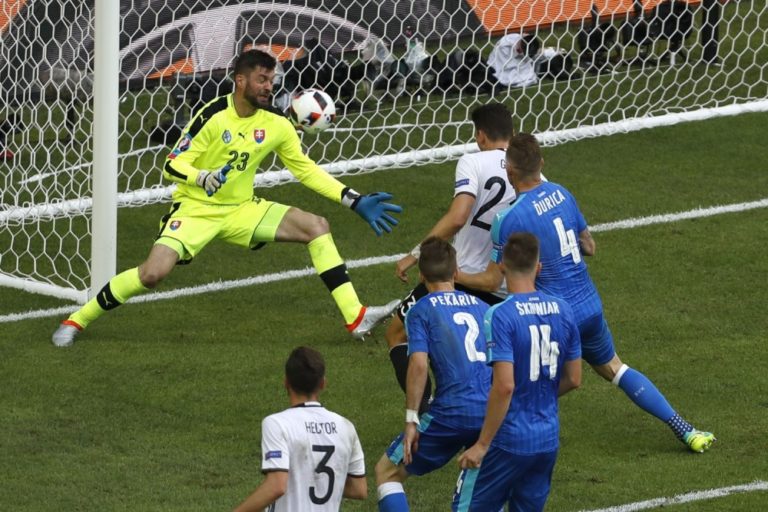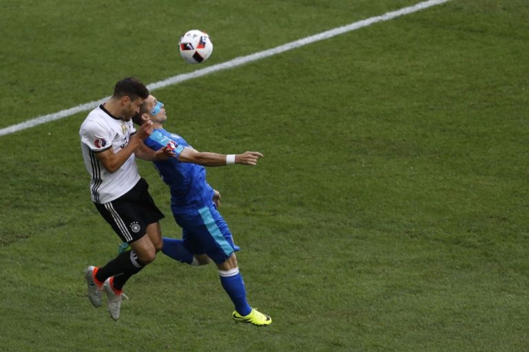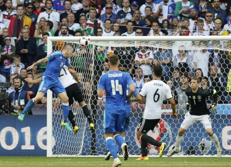 Slovenský futbalista Juraj Kucka hlavičkuje loptu nemeckú bránu počas osemfinálového zápasu na majstrovstvách Európy. Lille, 26. jún 2016. Foto: SITA/AP