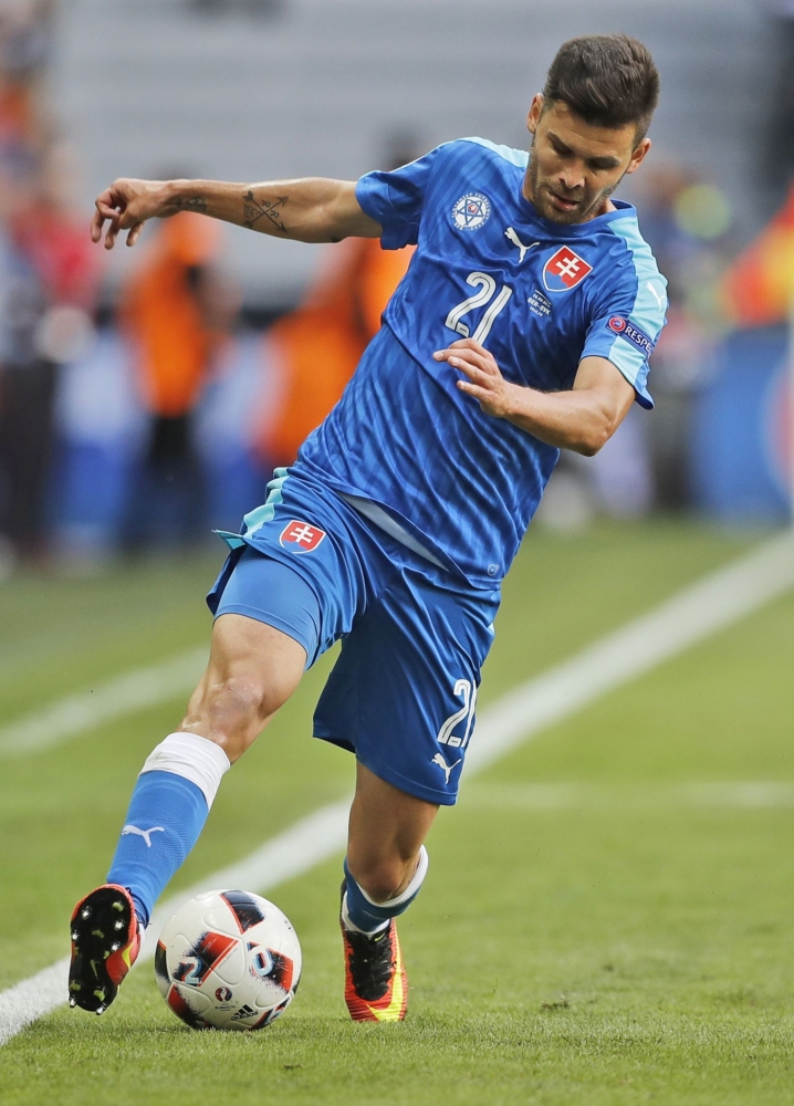 Slovenský futbalista Michal Ďuriš si spracováva loptu počas osemfinálového zápasu proti Nemecku na majstrovstvách Európy. Lille, 26. jún 2016. Foto: SITA/AP