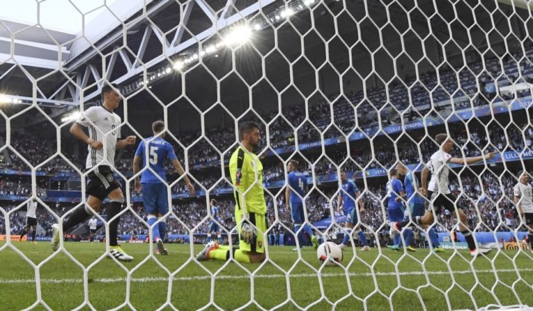 Nemecký futbalista Mario Gómez sa raduje z gólu v sieti slovenského brankára Matúša Kozáčika počas osemfinálového zápasu na majstrovstvách Európy. Lille, 26. jún 2016. Foto: SITA/AP
