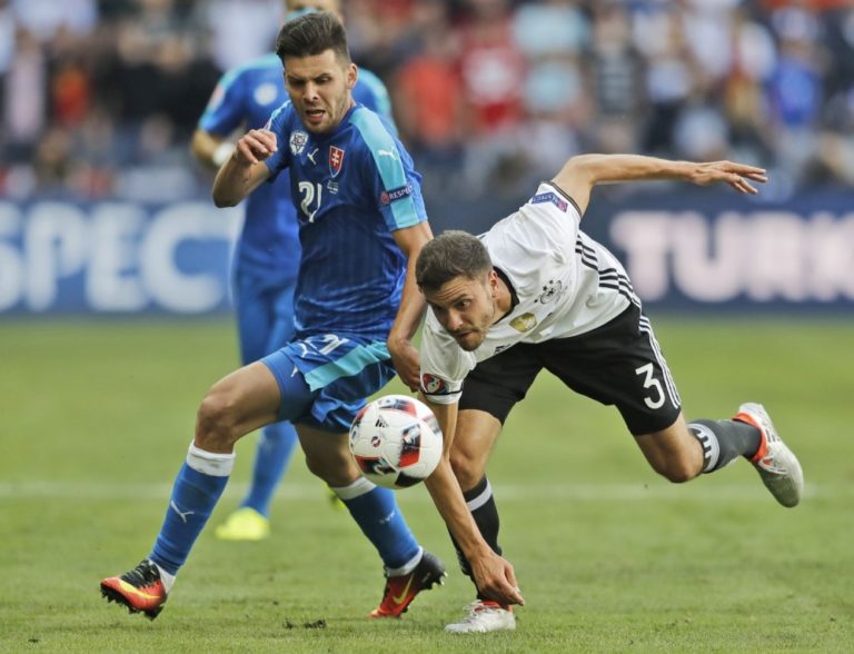 Nemecký obranca Jonas Hector v súboji so Slovákom Jurajom Kuckom počas zápasu na majstrovstvách Európy. Lille, 26. jún 2016. Foto: SITA/AP