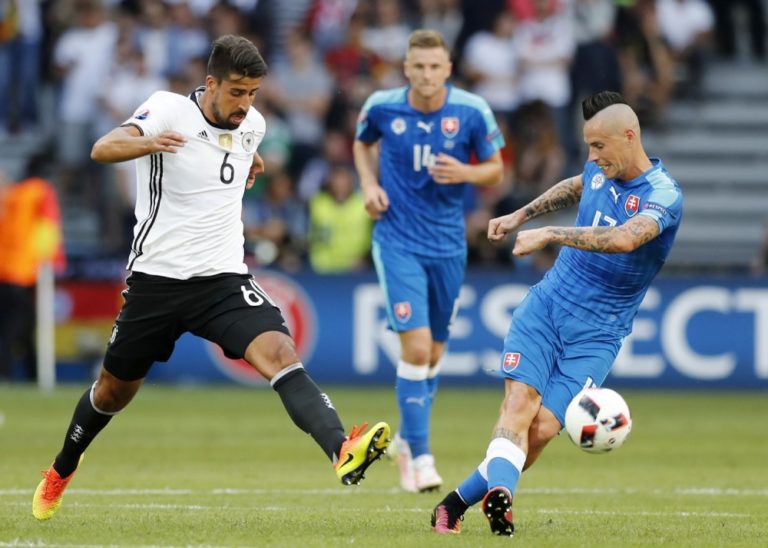 Slovenský futbalista Marek Hamšík v súboji s Nemcom Samim Khedirom počas osemfinálového zápasu na majstrovstvách Európy. Lille, 26. jún 2016. Foto: SITA/AP