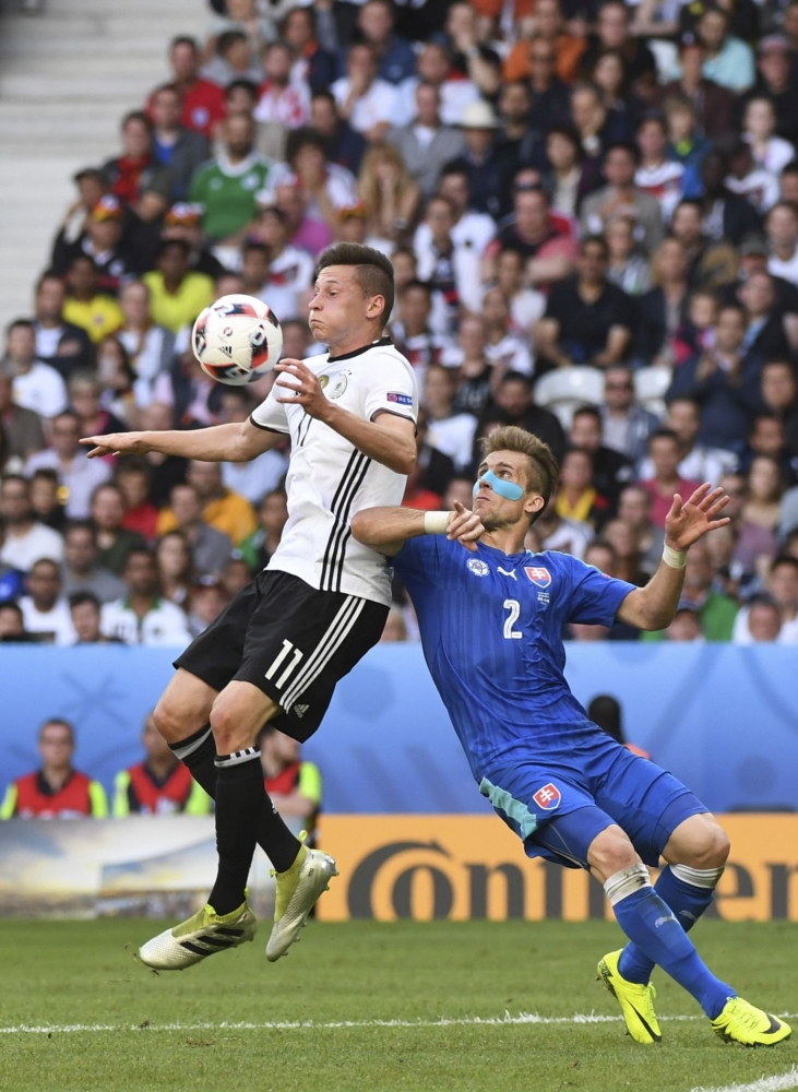 Slovenský futbalista Peter Pekarík v súboji s Nemcom Julianom Draxlerom počas osemfinálového zápasu na majstrovstvách Európy. Lille, 26. jún 2016. Foto: SITA/AP