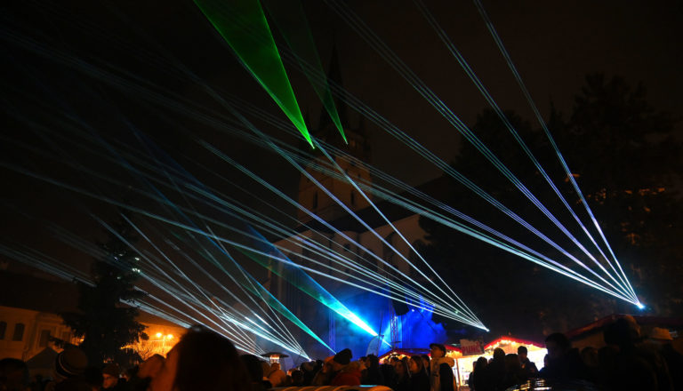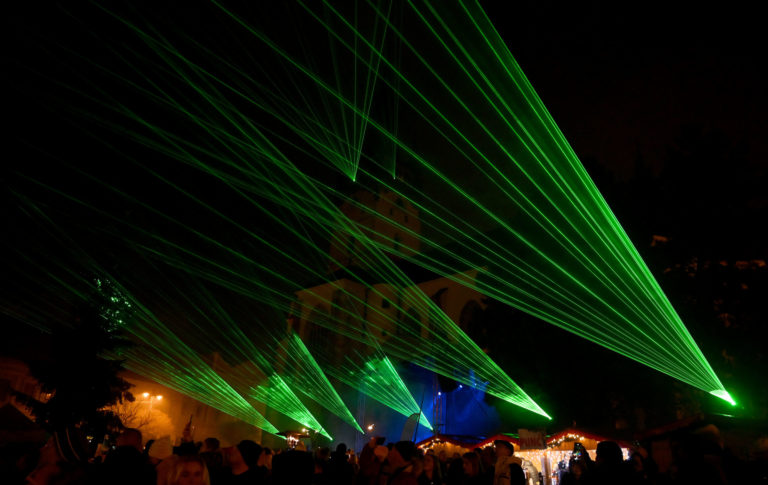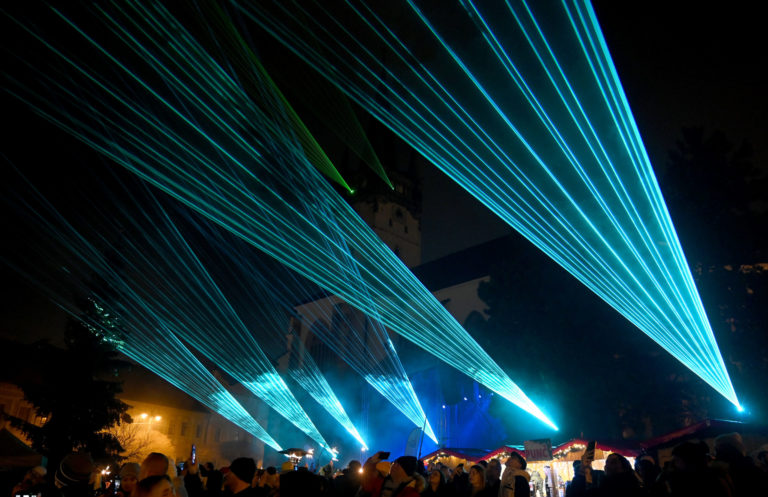 Svetelno laserová šou počas osláv príchodu Nového roka v Prešove. Prešov 1. január 2024. Foto: SITA/Viktor Zamborský