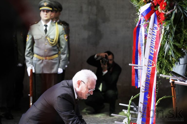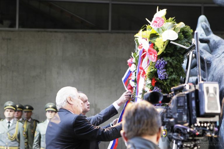 Zľava v popredí: Prezident ČR Miloš Zeman a prezident SR Andrej Kiska počas pietneho aktu kladenia vencov pri Pamätníku SNP v rámci centrálnych osláv 70. výročia Slovenského národného povstania. Banská Bystrica, 29. august 2014. Foto: SITA/Ján Viazanička