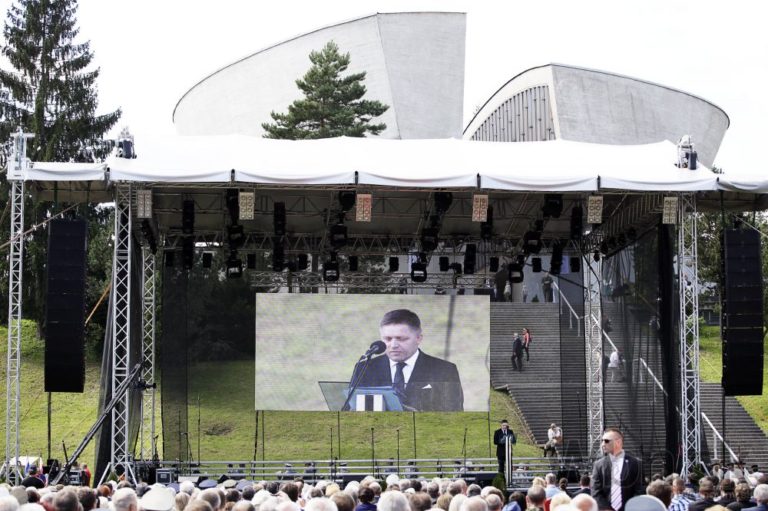 Premier SR Robert Fico (uprostred) počas príhovorov pri Pamätníku SNP v rámci centrálnych osláv 70. výročia Slovenského národného povstania. Banská Bystrica, 29. august 2014. Foto: SITA/Ján Viazanička