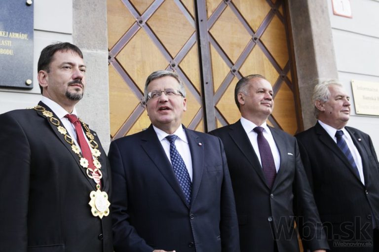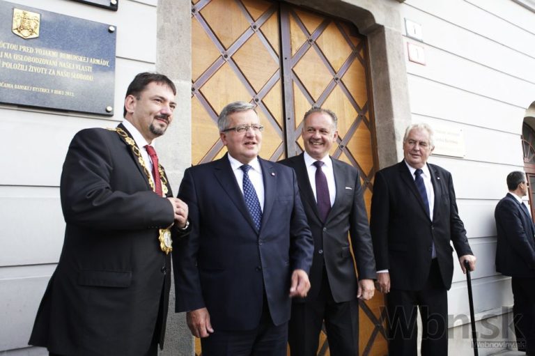 Zľava: Primátor mesta Banská Bystrica Peter Gogola, prezident Poľska Bronislaw Komorowský, prezident ČR Miloš Zeman a prezident SR Andrej Kiska pred obedom podávaným prezidentom SR počas centrálnych osláv 70.výročia Slovenského národného povstania. Banská Bystrica, 29. august 2014. Foto: SITA/Ján Viazanička
