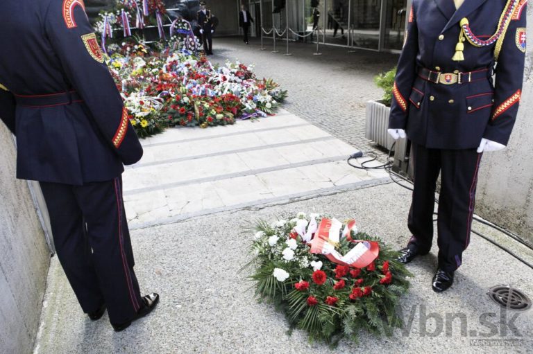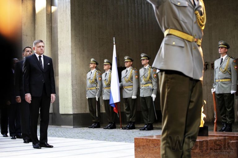 Premiér SR Robert Fico (vľavo) počas pietneho aktu kladenia vencov pri Pamätníku SNP v rámci centrálnych osláv 70. výročia Slovenského národného povstania. Banská Bystrica, 29. august 2014. Foto: SITA/Ján Viazanička