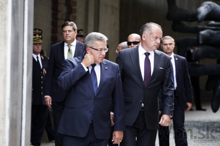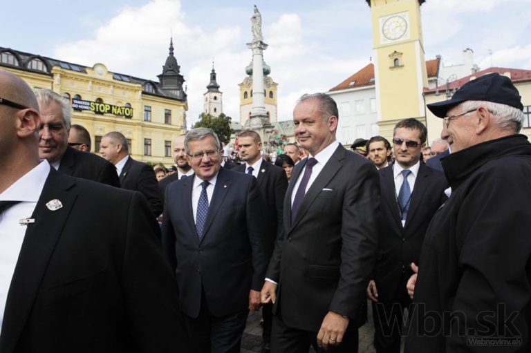 Prezident SR Andrej Kiska (uprostred vpravo) a poľský Bronislaw Komorowski odchádzajú po položení pietneho venca v rámci centrálnych osláv 70. výročia Slovenského národného povstania (SNP). Banská Bystrica, 29. august 2014. Foto: SITA/Ján Viazanička