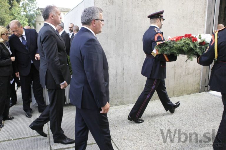 Prezident SR Andrej Kiska (uprostred vľavo) a poľský prezident Bronislaw Komorowski (uprostred) počas pokladania pietneho venca v rámci centrálnych osláv 70. výročia Slovenského národného povstania (SNP). Banská Bystrica, 29. august 2014. Foto: SITA/Ján Viazanička