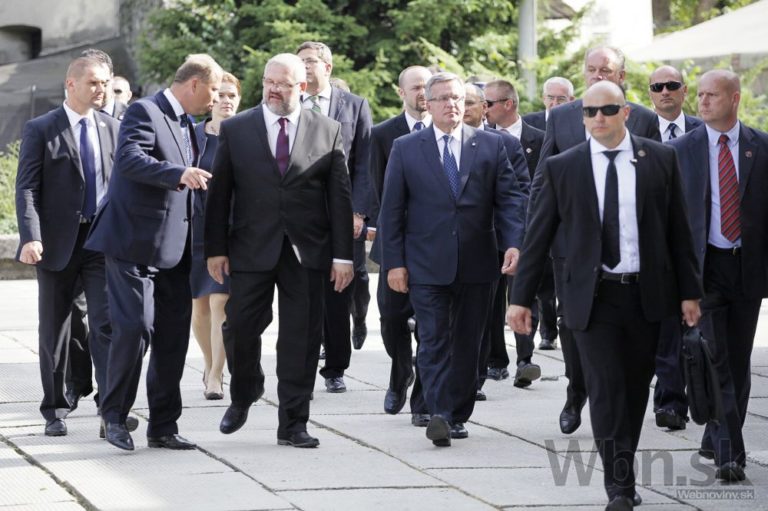 Riaditeľ múzea SNP Stanislav Mičev (uprostred vľavo) a poľský prezident Bronislaw Komorowský (uprostred) prichádzajú položiť pietny veniec v rámci centrálnych osláv 70. výročia Slovenského národného povstania (SNP). Banská Bystrica, 29. august 2014. Foto: SITA/Ján Viazanička