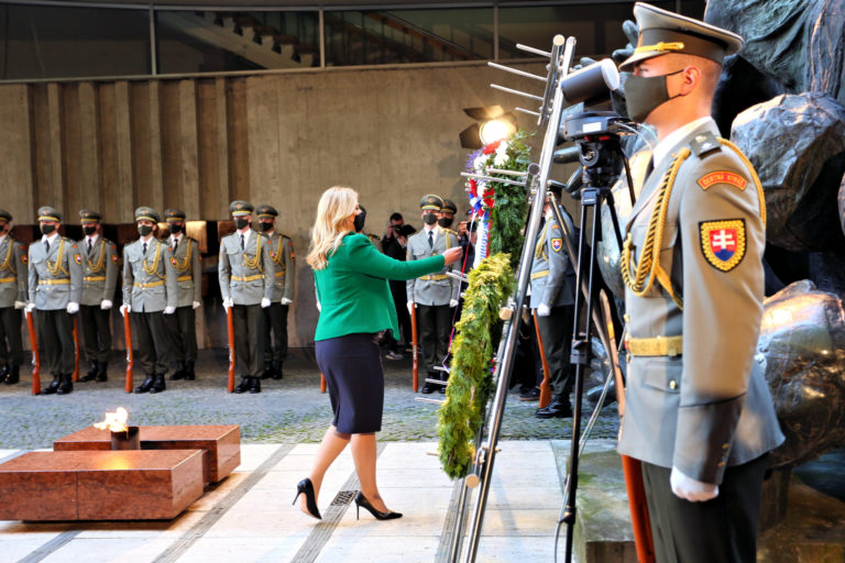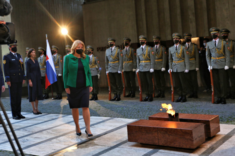 Prezidentka SR Zuzana Čaputová (v popredí) počas pietneho aktu kladenia vencov v rámci osláv 77. výročia Slovenského národného povstania (SNP) v Banskej Bystrici. Banská Bystrica, 29. august 2021. Foto: SITA/Peter Rusko