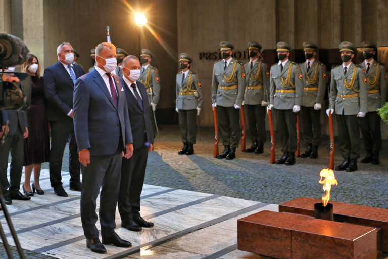 V popredí zľava: Predseda NR SR Boris Kollár a podpredseda Národnej rady (NR) SR Milan Laurenčík počas pietneho aktu kladenia vencov v rámci osláv 77. výročia Slovenského národného povstania (SNP) v Banskej Bystrici. Banská Bystrica, 29. august 2021. Foto: SITA/Peter Rusko