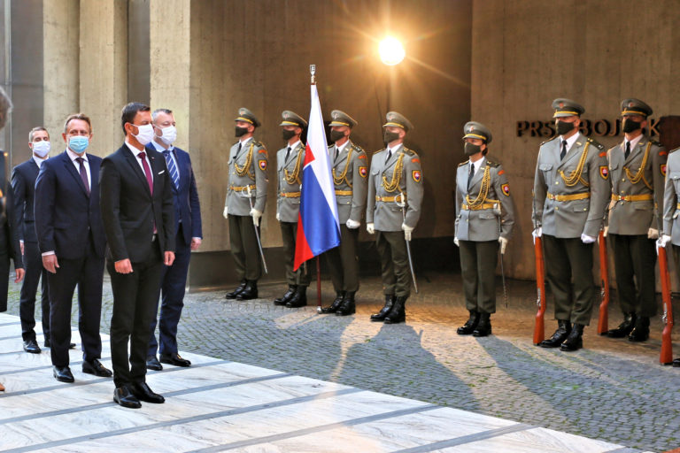 Zľava: Štátny tajomník Ministerstva zahraničných vecí a európskych záležitostí Martin Klus, minister pôdohospodárstva a rozvoja vidieka SR Samuel Vlčan, predseda vlády SR Eduard Heger a minister práce, sociálnych vecí a rodiny SR Milan Krajniak počas pietneho aktu kladenia vencov v rámci osláv 77. výročia Slovenského národného povstania (SNP) v Banskej Bystrici. Banská Bystrica, 29. august 2021. Foto: SITA/Peter Rusko