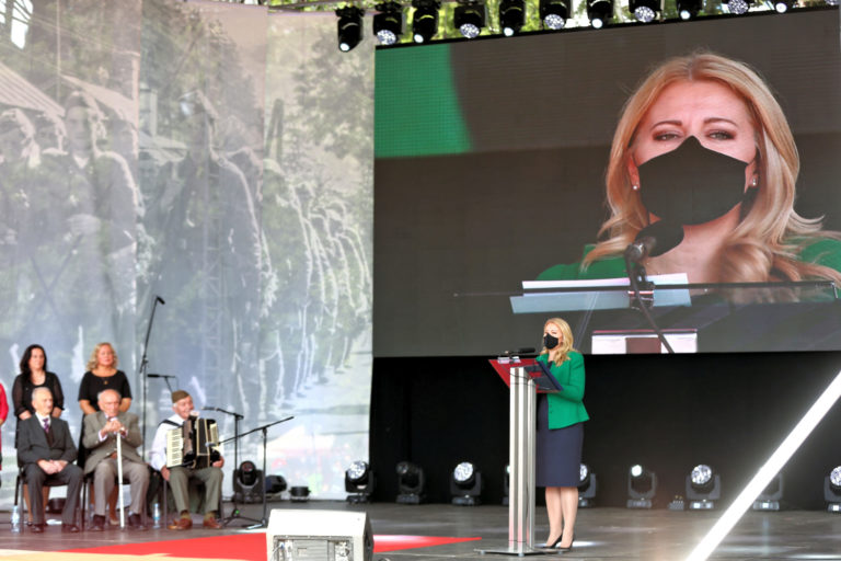 Prezidentka SR Zuzana Čaputová v príhovore (vpravo) počas osláv 77. výročia Slovenského národného povstania (SNP) v Banskej Bystrici. Banská Bystrica, 29. august 2021. Foto: SITA/Peter Rusko